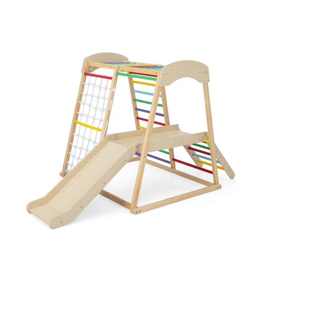 Interiérové montessori ihrisko je vyrobené z bezpečného a odolného prírodného materiálu. Drevené ihrisko je skvelým prvkom pre deti všetkých vekových kategórií. Menšie deti môžu používať rebriny pre svoje prvé pokusy vstávania, zatiaľ čo staršie deti môžu liezť po priečkach, kĺzať, alebo využiť lezúcu sieť. Naplno sa rozvíja ich motorické schopnosti a zručnosti. Deti môžu v bezpečnom prostredí domova trénovať rovnováhu, obratnosť a koordináciu. Montessori leziace ihrisko je stabilné a spĺňa všetky bezpečnostné normy. Rozmery ihriska: 205 x 112 x 120 cm Rozmery šmykľavky: 72 x 32 cm Vyrobené z prírodného dreva Nosnosť do 60 kg Vhodné pre deti: od 1 rokaDodatočné parametre