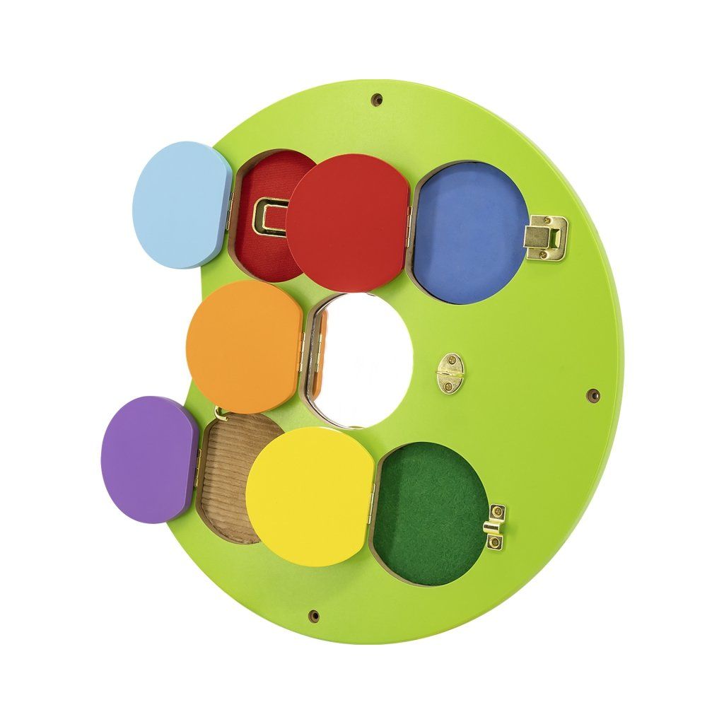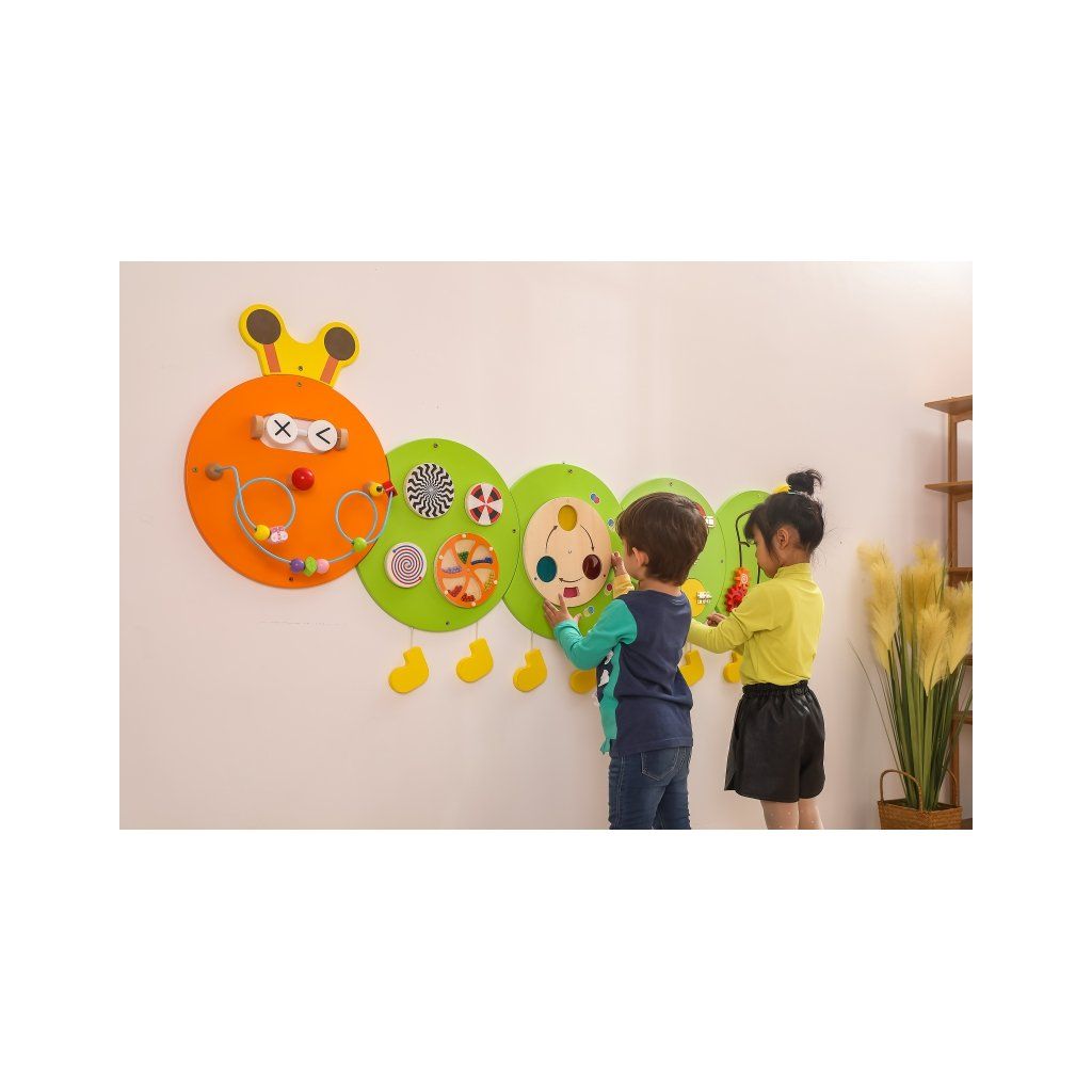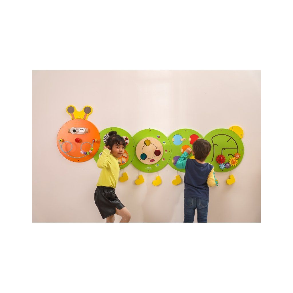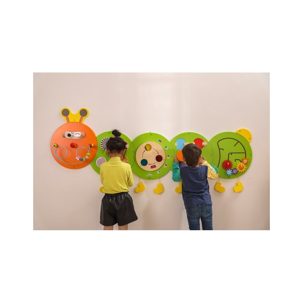 Multifunkčná doska s roztomilým obrázkom húsenice. Súprava sa skladá z 5 tabúľ s rôznymi funkciami. Tabule sa veľmi ľahko zostavujú a rozkladajú a tiež prepravujú. Pomáha deťom učiť sa farby, zvuky, grafiku. Rozvíja tiež koordináciu ruka-oko a sociálne zručnosti. Dômyselná kombinácia hračiek pre školy, škôlky, vzdelávacie centrá a verejné miesta. Tento výrobok je vhodný pre deti staršie ako 18 mesiacov. Nástenná tabuľa pozostávajúca z 5 častí v tvare húsenice,- každá časť je úplne iná: Hlava húsenice má kovovú slučku s drevenými korálkami, ktoré môže dieťa ľubovoľne prestavovať pozdĺž bludiska. Na druhej doske sú kolieska s rôznymi vzormi, ich otáčaním dieťa vykonáva úžasné vizuálne efekty v závislosti od rýchlosti, akou sa koliesko otáča. Na tretej doske sa dieťa môže naučiť o farbách, ktoré vznikajú zmiešaním 3 základných farieb: červenej, žltej a modrej. Na štvrtej tabuli sa nachádza 5 druhov zámkov. Po otvorení každého z nich sa dieťa môže zoznámiť s 5 rôznymi materiálmi (EVA, suchý zips, zrkadlo, plsť, vlnitá lepenka), Posledná tabuľa vyzerá jednoducho len na prvý pohľad. Deti si môžu samy zostaviť rôzne konštrukcie ozubených kolies. Doska je vyrobená z lakovaného dreva a natretá netoxickými farbami v pestrých farbách. Parametre: Rozmery: š.185 x v.76 x hl.12 cm Materiál: drevoDodatočné parametre
