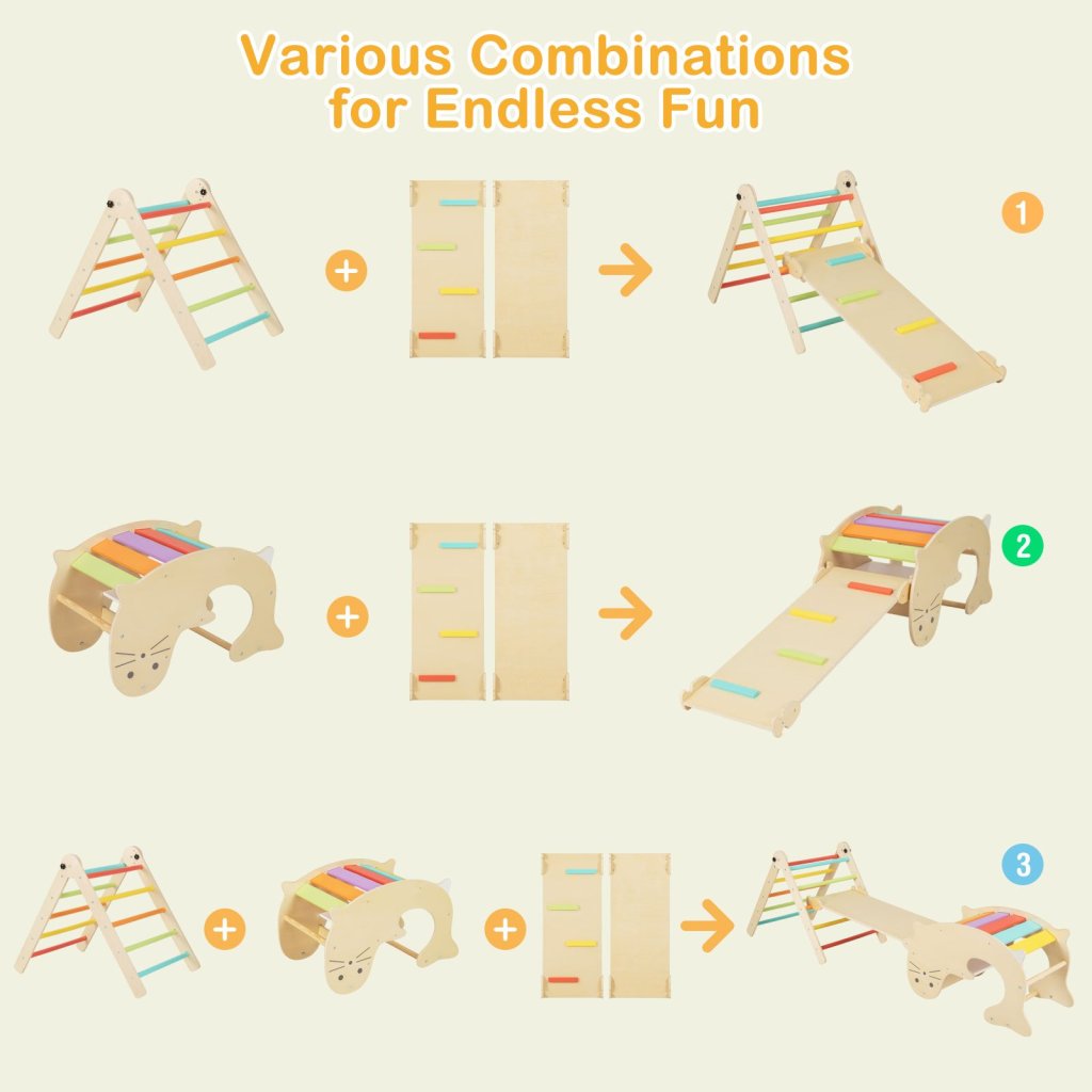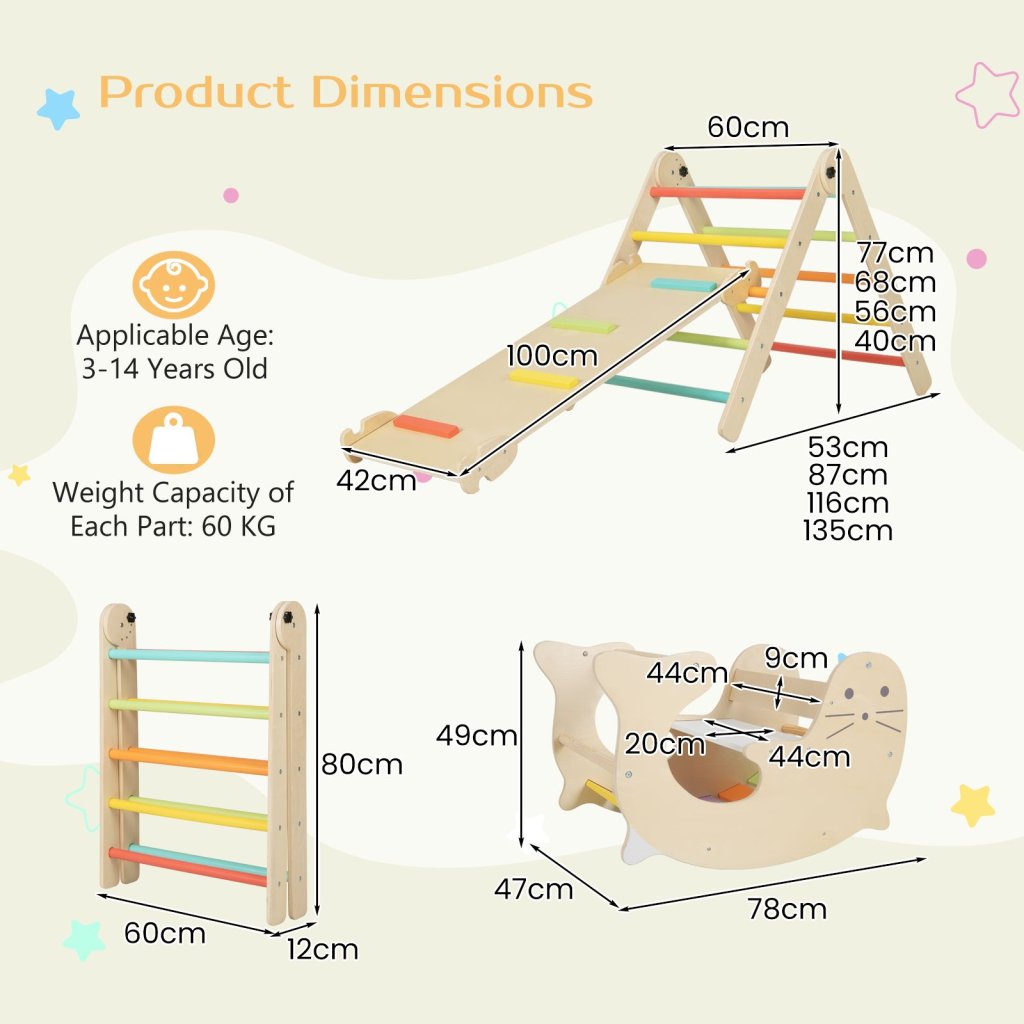 Unikátna sada hojdačky a Piklerového trojuholníka s obojstrannou doskou / šmýkačkou poskytne deťom neobmedzené možnosti v rozvoji ich pohybových zručností. Poskytne deťom dostatočný priestor na ich aktívnu hru, pomáha rozvíjať hrubú a jemnú motoriku, koordináciu, kreativitu. Jednotlivé diely je možné používať súčasne aj samostatne, všetko sa dá ľahko prispôsobiť aktuálnym pohybovým potrebám a schopnostiam Vašich detí. Kombinácia pastelových farieb a dreva pôsobí veľmi moderne, samozrejmosťou sú aj bezpečnostné prvky, v podobe zaoblených rohov, či bezpečnostné poistky proti rozloženiu. Súprava obsahuje: Piklerový trojuholník s obojstrannou doskou Piklerový trojuholník je šplhacia pomôcka, ktorá ponúkne deťom veľa možností na rozvoj ich pohybových aktivít. Lezenie, preliezanie, je obľúbenou kratochvíľou všetkých najmenších. Ľahko je možné pripojiť obojstrannú dosku, ktorá je z jednej strany koncipovaná ako leziaca stena a po jej otočení slúži ako šmykľavka. Doska je možné k trojuholníku pripojiť v rôznych výškach a prispôsobiť tak obtiažnosť veku s pohybovým schopnostiam detí. Trojuholník je opatrený poistkou proti rozloženiu. Drevená Montessori hojdačka Hojdačka v dizajne tuleňa je skvelým zábavným prvkom, ktorý rozvíja pohybové zručnosti Vašich detí, je vhodná aj pre tých najmenších. Deti môžu hojdačku používať rôznymi spôsobmi v závislosti od ich veku a schopností, a to ako hojdaciu kolísku, hrací stolček alebo po otočení na preliezanie a podliezanie. Naplno sa tak rozvíja ich motorické schopnosti a zručnosti. Deti môžu v bezpečnom prostredí domova trénovať rovnováhu, obratnosť, silu a koordináciu. Rozmery Montessori hojdačky: 80 x 47 x 50 cm Rozmery Piklerového trojuholníka: 80 x 60 x 12 cm Rozmery rampy: 100 x 42 cmDodatočné parametre