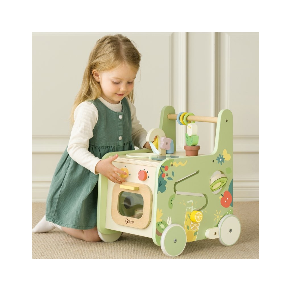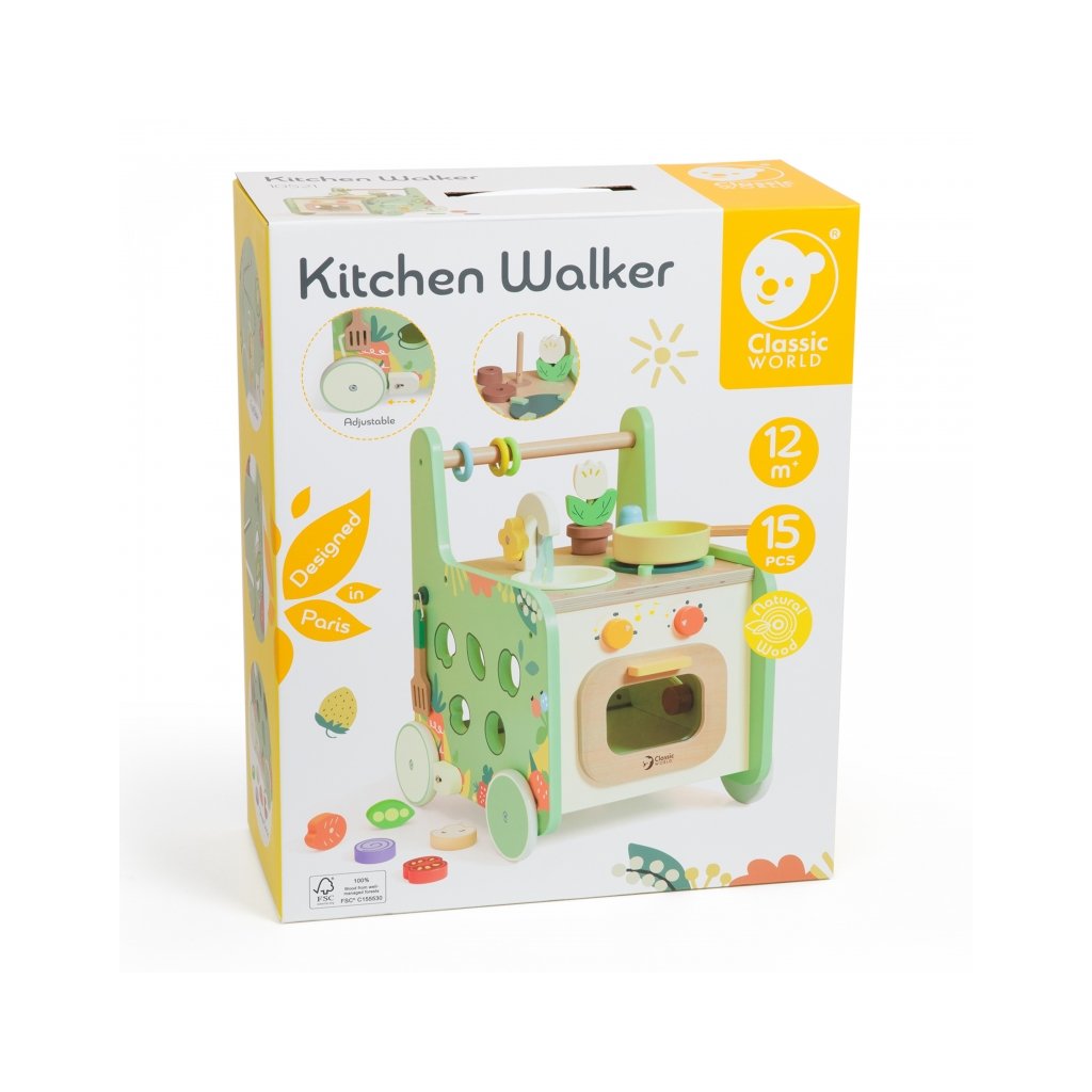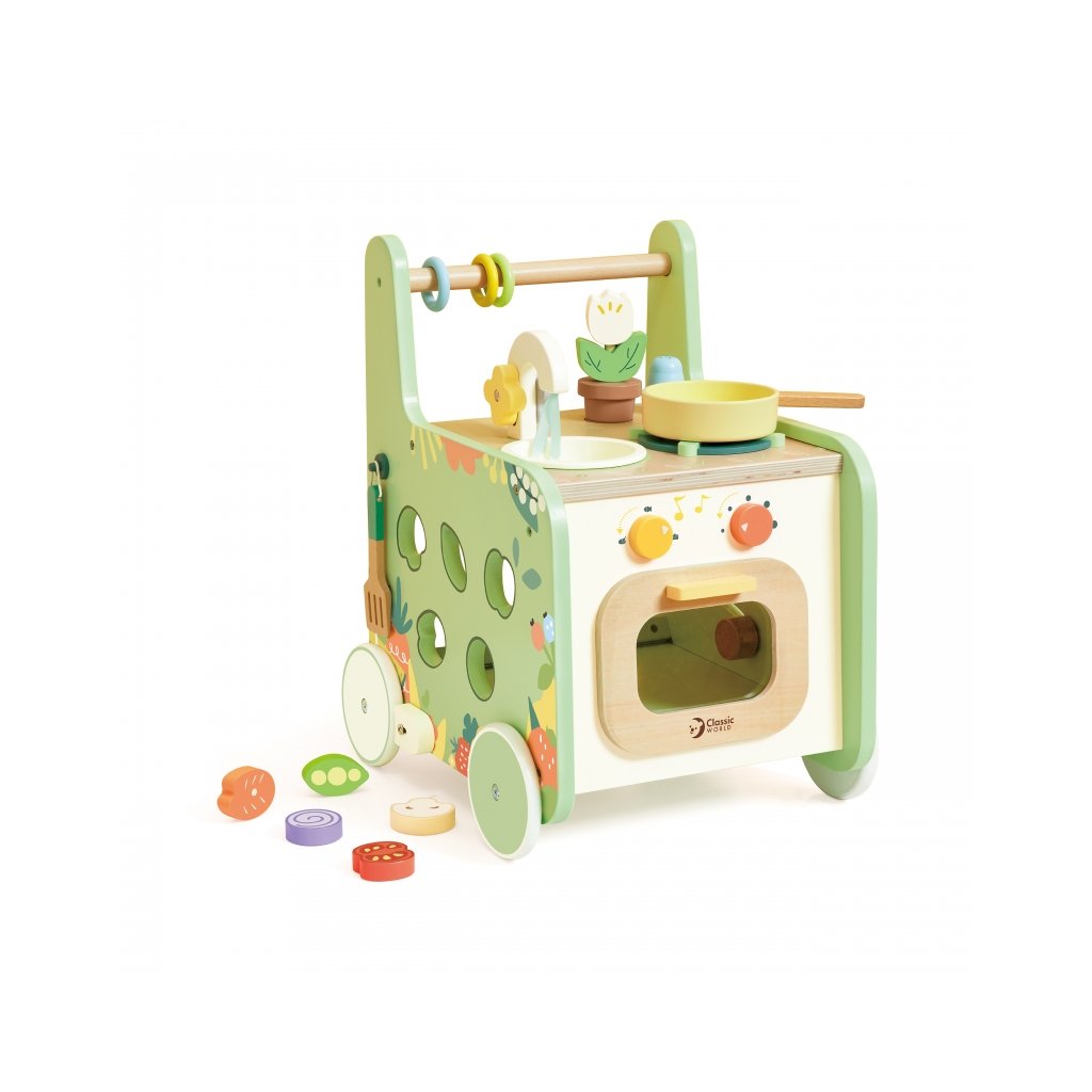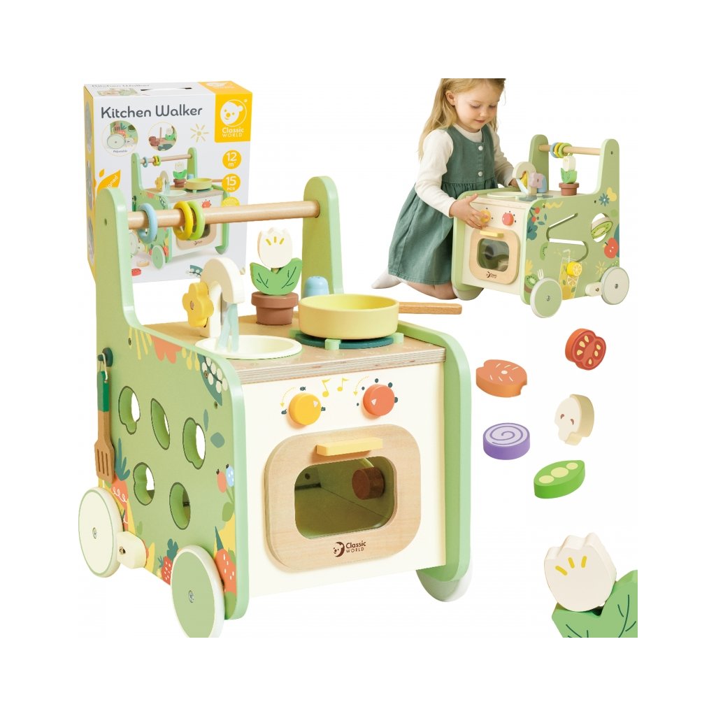 Interaktívne drevené chodítko 2v1 - kuchynka a pchací chodítko je multifunkčná hračka, ktorá rastie spolu s dieťaťom. Vďaka odnímateľným kolesám je možné zariadenie využívať ako stabilné pchací chodítko, a keď sa kolesá odstránia, premení sa na hraciu kuchynku. Hračka je vyrobená z prírodného dreva, má robustnú konštrukciu a podporuje rozvoj motorických zručností aj rovnováhy. Deti môžu otáčať gombíky sporáka, „variť“ na platniach a využívať úložný priestor vo vnútri kuchynky napríklad na ukladanie herných doplnkov. Je bezpečná pre deti od 12 mesiacov. Táto kuchynka podporuje kreativitu, hru na rolky a rozvoj jemnej motoriky, čím je ideálnym doplnkom detského herného kútika. Parametre: Rozmery: 32.5 x 37.5 x 45.5 cm Materiál: drevo Vhodné pre deti: od 12 mesiacovDodatočné parametre