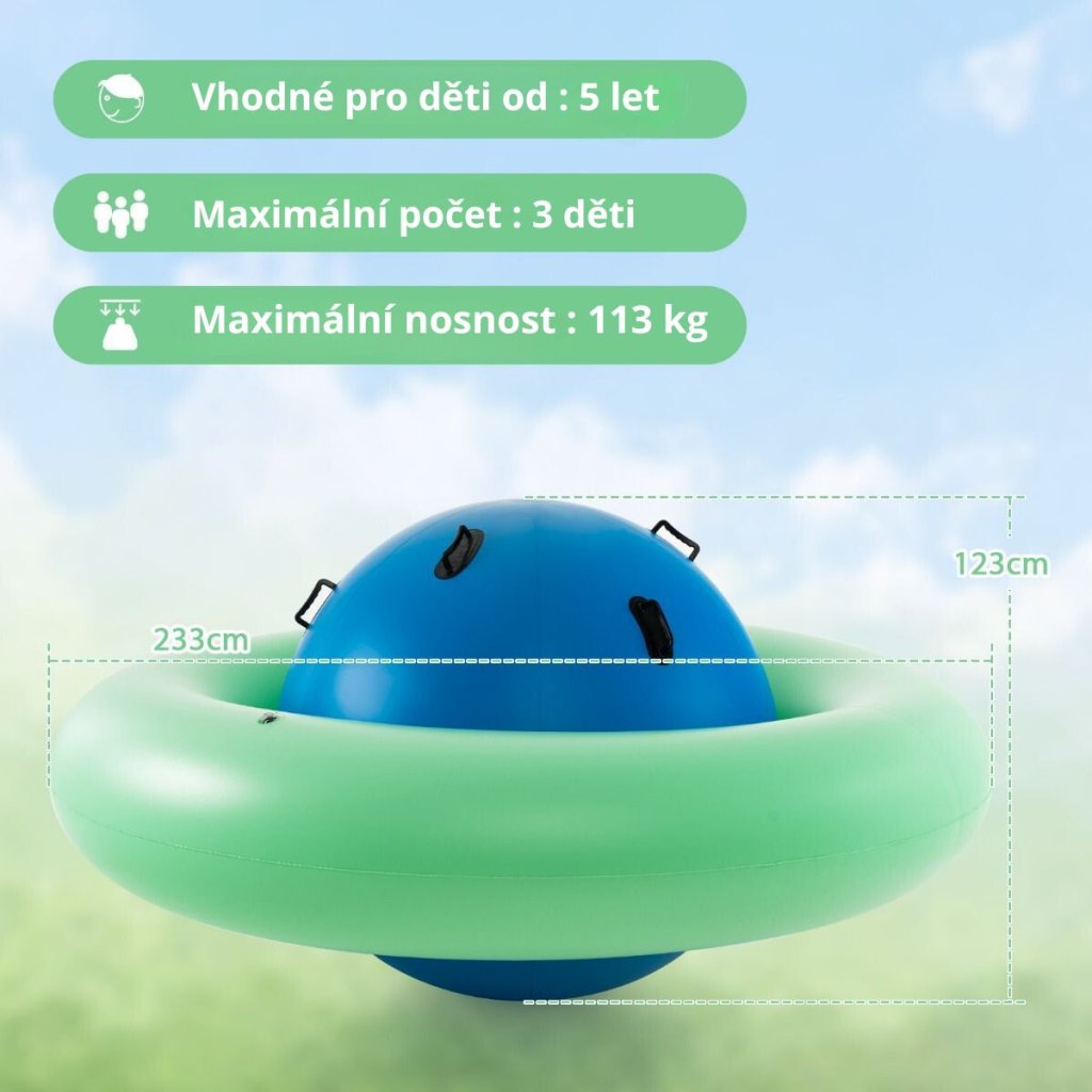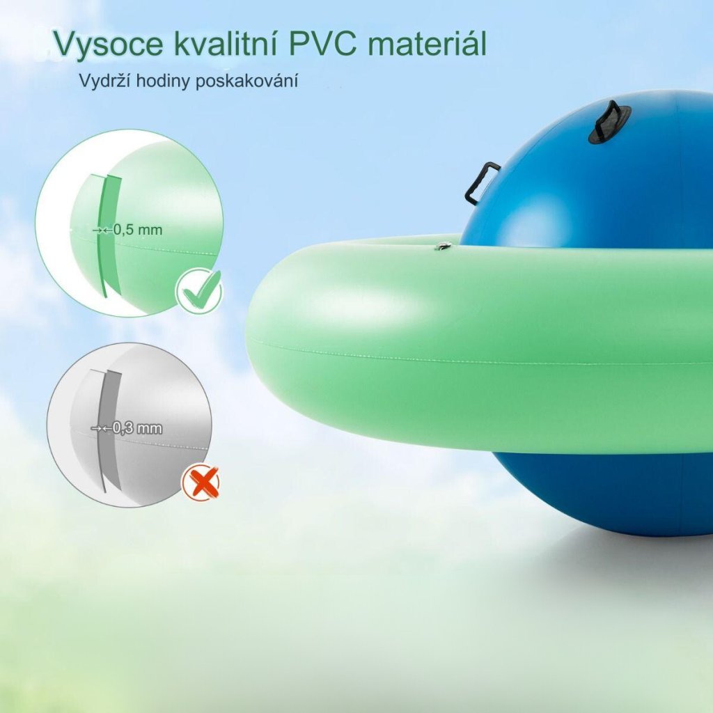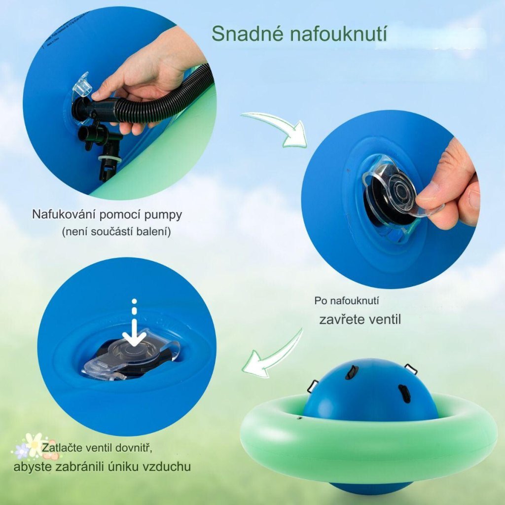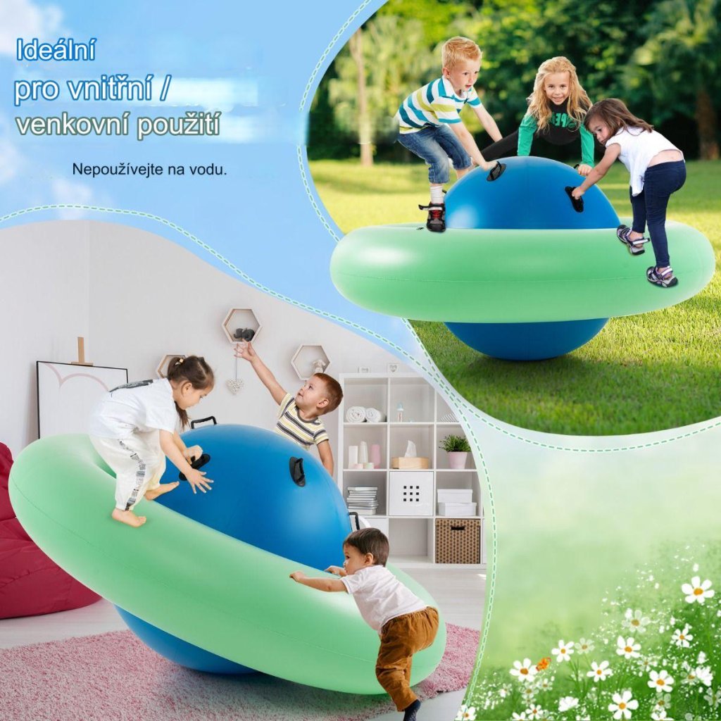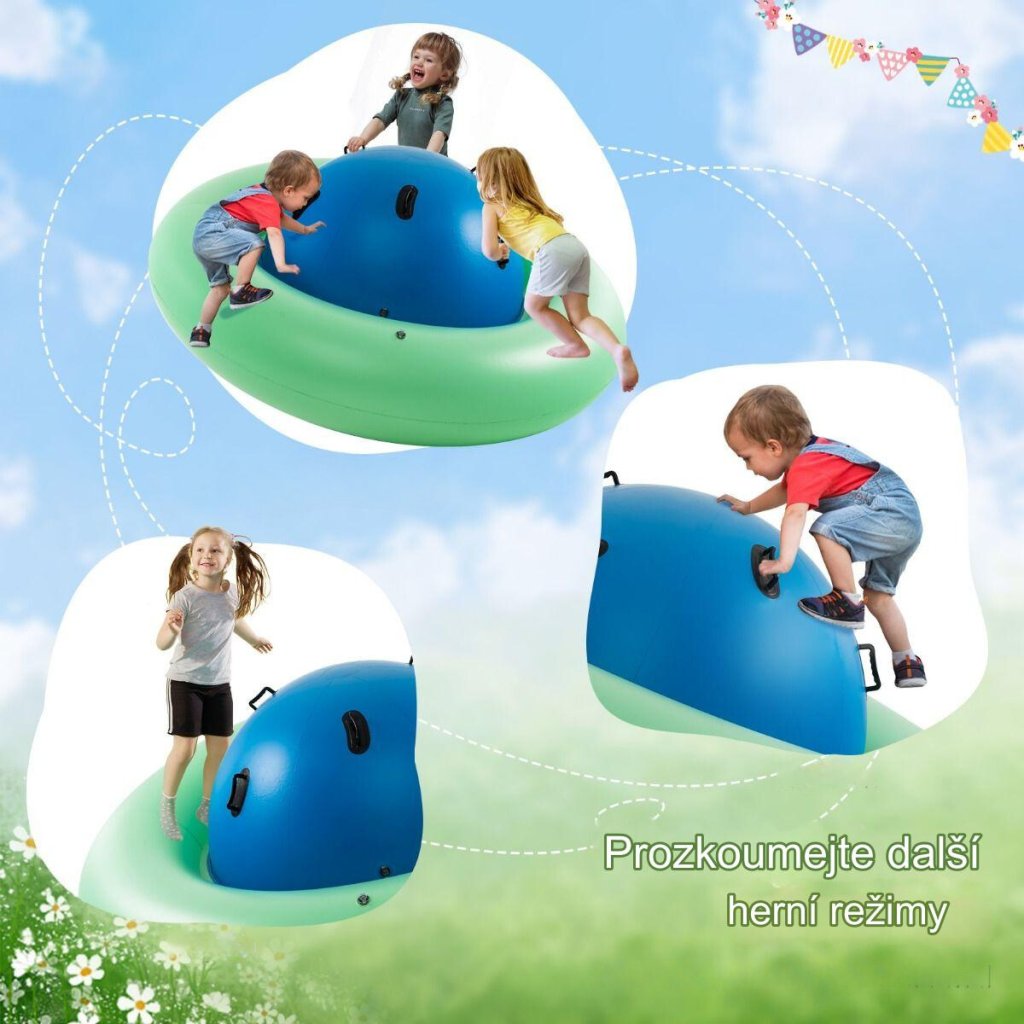Obria skákacia lopta podobajúca sa vesmírnej lodi ponúka deťom nevšedný a nádherný herný zážitok. Je ideálny až pre 3 hráčov. K dispozícii je 6 vstavaných rukovätí. A ergonomický tvar každej rukoväte je vhodný pre malé detské ruky, takže ju ľahko uchopia a sú pripravené sa kotúľať, nakláňať, šplhať a poskakovať! Nafukovacia skákacia lopta je vyrobená z PVC materiálu s hrúbkou 0,5 mm a jeho použitie je bezpečné a odolné, aby poskytoval roky zábavy. Nafukovacia skákacia lopta sa skladá z dvoch samostatných komôr so samostatnými ventilmi, ktoré ľahko nafúknete pomocou pumpičky (NIE JE súčasťou balenia). Odporúča sa najprv nafúknuť modrý krúžok. Potom, čo je úplne nafúknutý, zatvorte ventil a zatlačte ventil dovnútra, aby sa zasunul. Pomáha im tiež budovať silu, čo má pozitívny vplyv na motoriku, dynamickú rovnováhu a koordináciu tela. Nepoužívajte na vodu. Používajte prosím pod dohľadom rodičov. Neodporúča sa používať vo veterných dňoch. Z balančných dôvodov by bolo lepšie, keby sa hrali dve až tri deti súčasne. Pokiaľ ho nepoužívate, vyfúknite ho a uložte na tienistom a vetranom mieste. Jednoduché nafukovanie a vyfukovanie vďaka dvojstupňovým ventilom Kompaktný, skladací formát uľahčuje skladovanie Vhodné pre vnútorné aj vonkajšie použitie Farba: zelená + modrá Materiál: PVC Celkové rozmery: 223 x 123 cm (priemer x V) Dĺžka rukoväte: 10 cm Max. nosnosť: 113 kg Odporúčaný vek: od 5 rokov Max. počet hráčov: 3 deti Čistá hmotnosť: 7,5 kg Nejedná sa o hračku do vody ani o vybavenie na záchranu života. Obsah balenia: 1 x nafukovacia hračka na skákanie a hojdanie 1 x návodDodatočné parametre