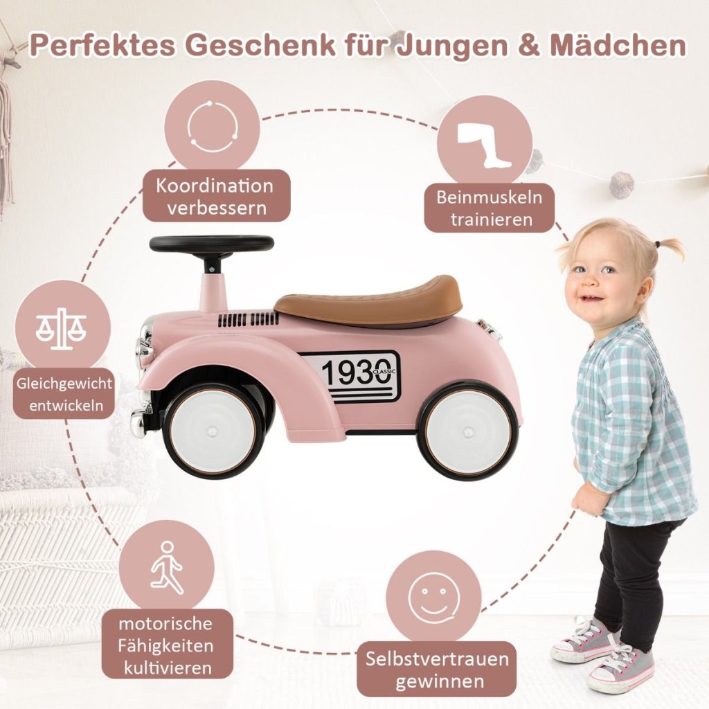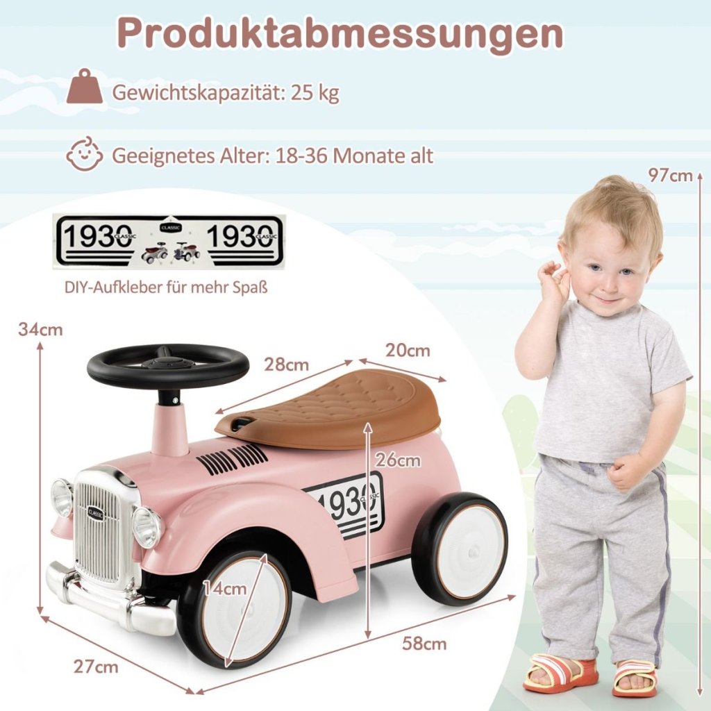 Toto retro auto s pojazdom má realistický volant so zvukom, ktorý deťom umožňuje ľahko zatáčať doľava alebo doprava. Vďaka veľkému a zakrivenému sedáku ponúka toto odrážadlo deťom pohodlné sedenie. Vďaka úložnému priestoru pod sedačkou sú navyše veci detí vždy po ruke. Sedadlo môžete zamknúť alebo odomknúť pomocou ľahko použiteľného gombíka. Detské ostrkovadlo má 4 veľké kolesá, ktoré sú protišmykové, odolné proti opotrebeniu a tlmia nárazy. Vďaka tomu sú navrhnuté tak, aby zabránili poškodeniu pôdy a prispôsobili sa rôznym typom ciest. Chladný vzhľad je atraktívny pre tých najmenších. Vďaka zaujímavým samolepkám je navyše ešte zábavnejšie navrhovať si sami design auta. Táto odrážadlo pomáha batoľatám trénovať svaly nôh, rozvíjať motorické zručnosti, rozvíjať rovnováhu, zlepšovať koordináciu a získavať sebavedomie. Obmedzenie riadenia 40° zaisťuje bezpečnú jazdu Farba: Ružová Materiály: PP, ABS, EVA, K živici Rozmery produktu: 58 x 27 x 34 cm (D x Š x V) Rozmery operadla: 28 x 20 (D x Š) Výška sedadla: 26 cm Priemer koliesok: 14 cm Čistá hmotnosť: 2,5 kg Maximálna nosnosť: 25 kg Vhodný vek: 1 1/2 – 3 roky Obsah balenia: 1 x Vodičská hračka pre deti 1 x dekoratívna samolepka 1 x návodDodatočné parametre