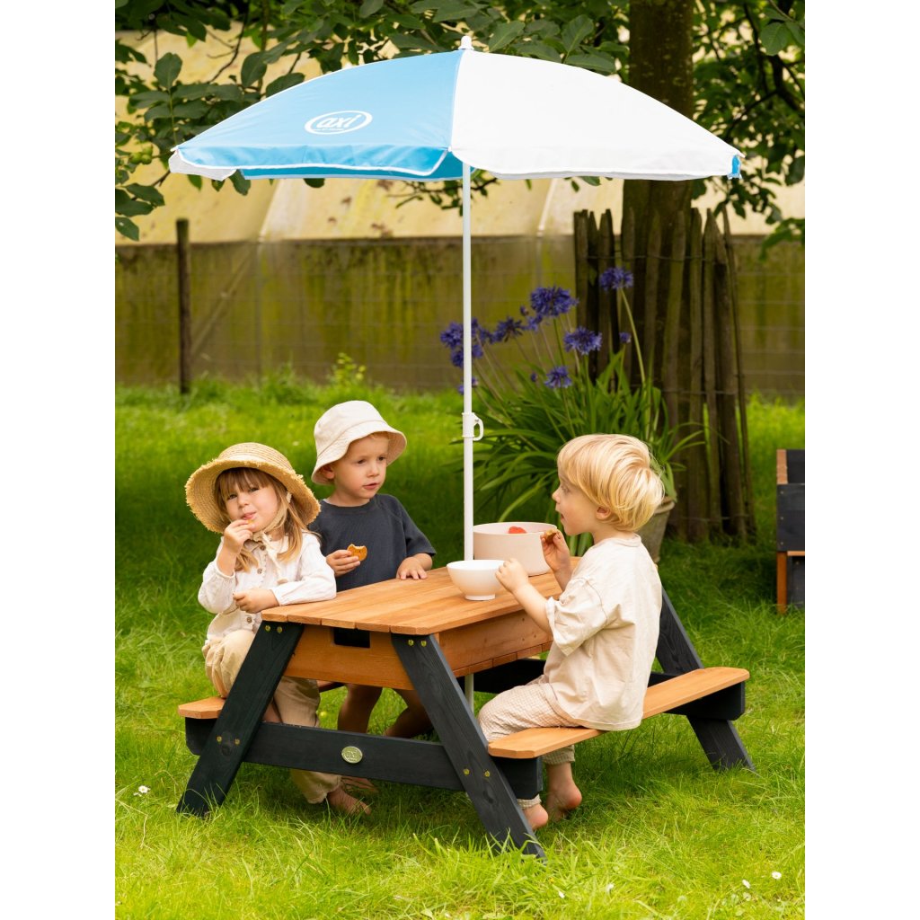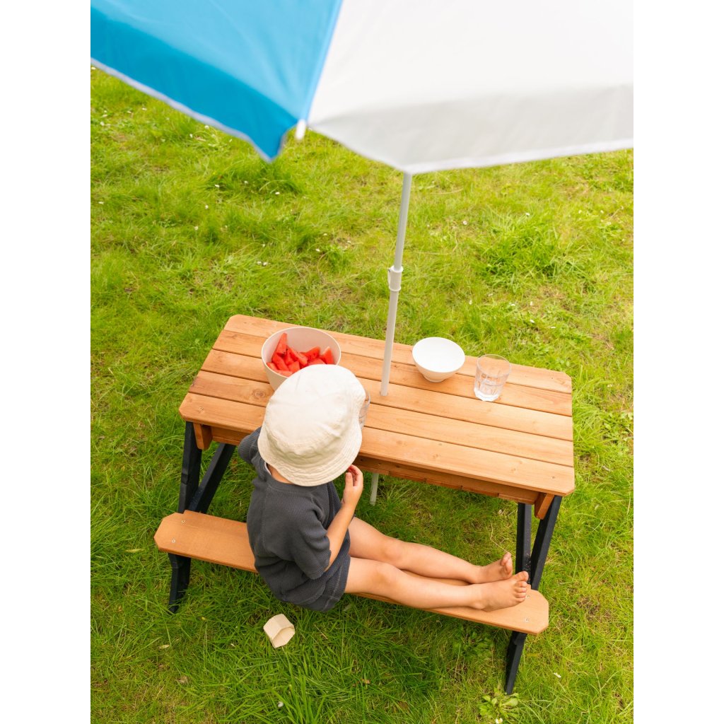 Stolček s lavičkou a úložným boxom je vhodný každú na záhradu. V okamihu si deti môžu stôl premeniť na piknikový, kde si môžu vychutnať dobroty. Slnečník umožňuje, že sa deti môžu hrať bezpečne v tieni. Stolík je dodávaný v nenafarbenom stave, čo poskytuje deťom možnosť zapojiť svoju fantáziu a vytvoriť si farebnú variantu stolíka podľa ich priania. Hornú časť stolčeka môžu odkryť a majú vodný stôl, kde si užijú množstvo zábavy. Kompaktné rozmery. Veľmi dobrá stabilita stolíka. Ľahko vyberateľný plastový box na hračky, vodu alebo piesok Vhodné pre vnútorné aj vonkajšie použitie Parametre: Celková veľkosť: 48.7 x 97.7 x 95 cm Materiál: Plast, Drevo Hmotnosť: 14,2 kg Zahŕňa 2 nádoby na piesok alebo vodu (Až 8 litrov na zásobník)Dodatočné parametre