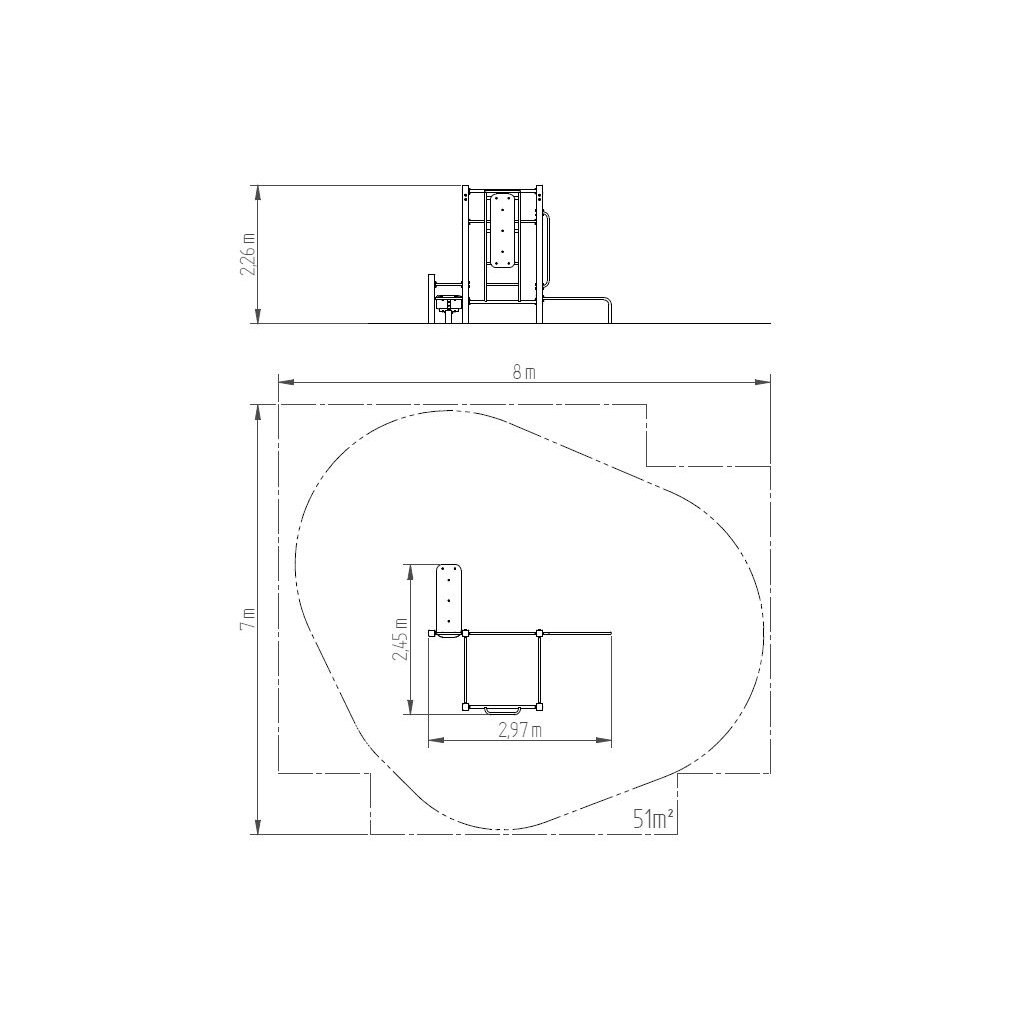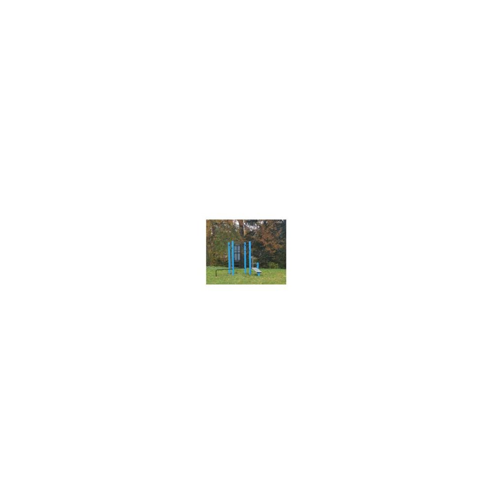 Tato základní workoutová sestava 014 je určena pro mládež a dospělé nebo pro uživatele s celkovou výškou nad 140 cm, aby na této sestavě mohli zvyšovat svou fyzickou kondici a zdatnost. Konkrétně na workoutové sestavě 014 lze posilovat především horní polovinu těla - posilování svalů paží, ramen a břicha, a také cvičení kliků. Zlepšuje flexibilitu pomocí protahovacích cvičení a rozvíjí koordinaci. Na této sestavě mohou cvičenci provádět silová cvičení, lezení, protahování, přitahování a různá procvičování těla. Sestava je doplněna o svislý žebřík s deskou, který může sloužit k protahování a posilování a také o šikmou lavici, kde lze posilovat břišní svaly. Posilování je vždy třeba přizpůsobit fyzického stavu cvičící osoby. Budete-li cítit jakoukoliv bolest, cvičení přerušte. Maximální hmotnost zatížení je 468 kg, povolený počet cvičenců max. 6. Workoutový prvek se skládá z: 1 x šikmá lavice 2 x hrazda 1 x kolmý žebřík (s deskou) 1 x nízká hrazda (kliky) Nosná konstrukce workoutové sestavy je vyrobena z konstrukční oceli (kovový profil 100 x 100 x 3 mm), která je proti korozi chráněna povrchovou úpravou zinkováním, čímž se docílí velmi výrazného prodloužení životnosti herního prvku a vypalovanou barvou KOMAXIT dle odstínu RAL. Tyto konstrukce jsou kotveny na betonové patky. Veškeré další kovové prvky např. madla, bradla, atd. jsou také upravovány zinkováním a vypalovanou barvou KOMAXIT dle odstínu RAL. Veškeré ostatní plochy jsou vyrobeny z vysoce kvalitního plastu HDPE (vysokotlaký, celoprobarvený polyetylen, který se vyznačuje vysokou barevnou stálostí, odolnosti proti UV záření a hlavně bezpečností, protože je nelámavý a nehrozí tak žádné nebezpečí zranění ostrými úlomky). Spojovací materiál je pozinkovaný nebo nerezový. Výška pádu workoutové sestavy 014 je 1,5 m. Proto je nezbytně nutné vytvořit v dopadové oblasti celé herní sestavy tlumící povrch pro případ pádu (např. 30cm silná vrstva písku, kačírku nebo drcené kůry). Náš tip - nejvýhodnější materiál pro vytvoření dopadové plochy tlumící pád z výšky až 3 m jsou pryžové zatravňovací desky Grass a Saf. Jejich instalace je jednoduchá pokládka na terén bez nutnosti zemních prací. Výhody – nevýhody jednotlivých podkladů: Dopadové zatravňovací dlaždice +zcela bezpečný, rovný , ohraničený povrch +plní tlumící funkci při dopadu +estetický vzhled +nenáročné na údržbu - vysoká cena Kačírek ( doporučujeme frakci 4/8) +plní drenážní funkci +plní tlumící funkci při dopadu cvičenců -kamínky se roznáší do okolního trávníku Písek -Zadržuje vodu -Roznáší se po zahradě -Dochází k mechanickému odírání dřevěných částí herní sestavy -Láká domácí zvířata ( především kočičky) Mulčovací kůra -Zadržuje vodu -Vytváří vlhkost u země -Sesychá – nutnost doplňovat - vznik plísní Workoutové hřiště - venkovní fitness sestava 014 je certifikována dle EN 16 630; 2016 jako fitness zařízení pro dospělé pro venkovní použití.Dodatočné parametre