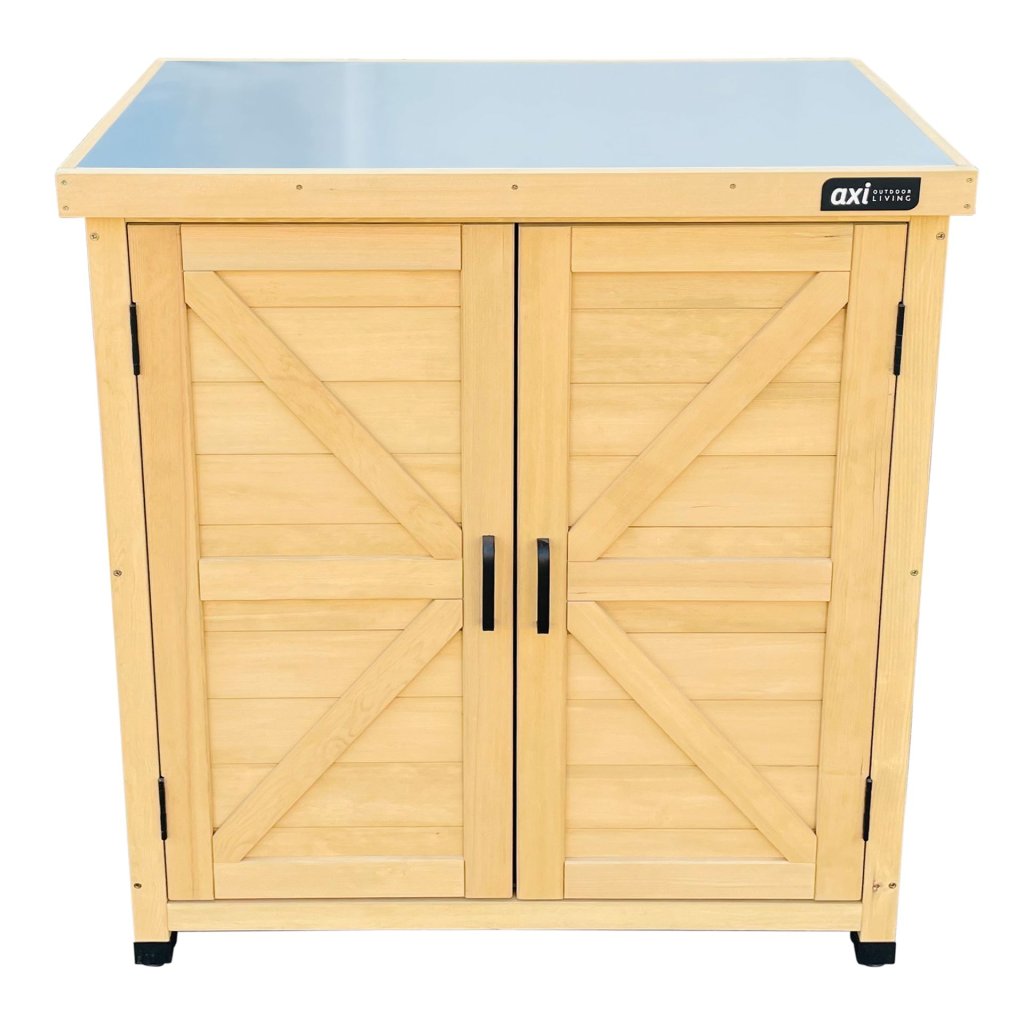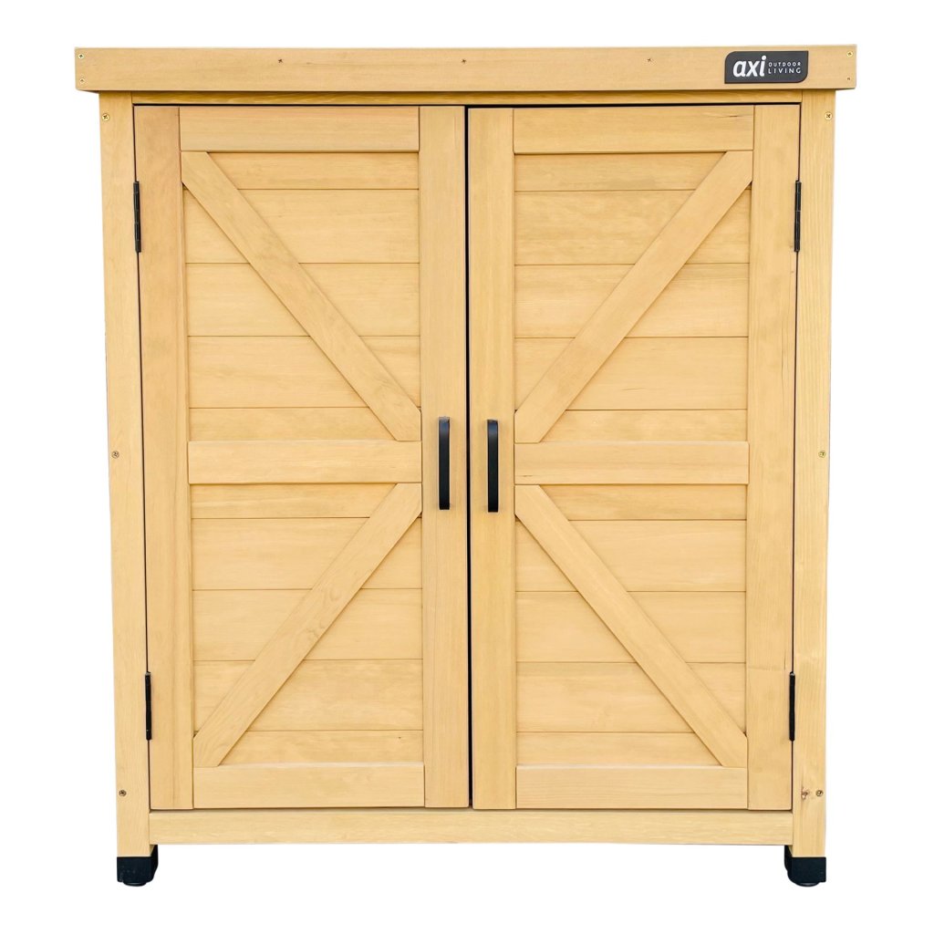 Skriňa je vybavená dvojkrídlovými dverami, ktoré umožňujú ľahký prístup k uloženým predmetom, a vďaka pevným dreveným policam ponúka praktický a dobre organizovaný úložný priestor. S rozmermi približne 80 × 45 × 93cm poskytuje dostatok miesta bez toho, aby zaberala príliš miesta na záhrade alebo v detskom kútiku.