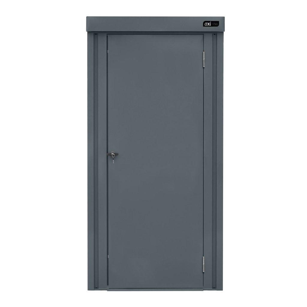 Skriňa má šikmú strechu, vďaka ktorej voda steká dozadu, a dvojkrídlové kovové vráta so zámkom a 2 kľúčmi zaisťujú bezpečné uloženie vašich vecí.