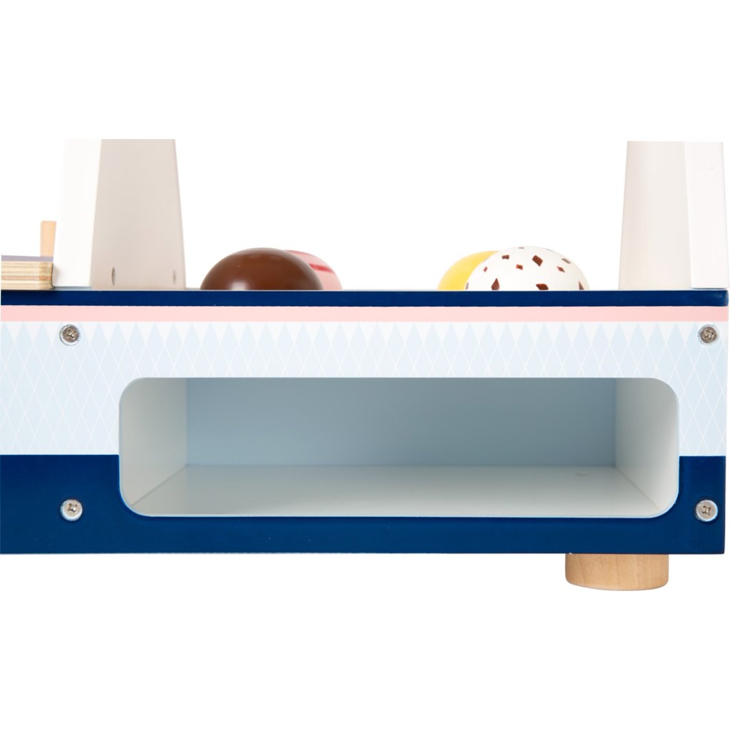 Hurá na zmrzlinu! Tento drevený zmrzlinový set je perfektný na leto i zimu. Zmrzlinový stánok je modro-ružový, má tiež prvky prírodného dreva, zákazníkov nadchne veľkým výberom dezertov a svojimi funkciami a príslušenstvom. Môžete si dať viac kopčekov zmrzliny, nanuky, točenú zmrzlinu, poháre, wafle ... a to všetko ozdobiť čerešničkou. Stánok má tiež plastovú vitrínu, mrazničku s plastovým poklopom, stojan na kornútky. Kopčeky zmrzliny a točená zmrzlina sú magnetické, v balení tiež nájdete tabuľku, na ktorú môžete písať kriedou. Zmrzlinu (vanilku, čokoládu, stracciatella a jahodu) môžete z vitríny vybrať a dať ju do misky alebo kornútku. Vytvorte si dezert podľa svojho gusta. Zmrlinové kopčeky a točená zmrzlina s magnetmi Osem rôznych príchutí zmrzliny, nanuky Kopčeky sa dajú skladať na seba vďaka magnetom Veľké a malé zmrzlinové kornútky, misky sa lyžicami, wafle Stánok s plastovou vitrínou, mraznička s priehľadným poklopom Rodovo neutrálne, jemný dizajn Rozmery: cca 45 x 21 x 47 cm, pracovná výška cca 11 cmDodatočné parametre